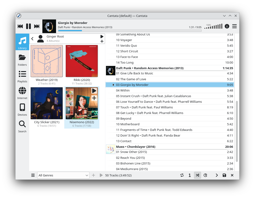 Cantata 是 MPD 的图形客户端,支持以下功能: * 多个 MPD 集合。 * 可自定义的布局。 * 播放队列中按专辑分组的歌曲。 * 上下文视图,显示当前曲目的艺术家、专辑和歌曲信息。 * 标签编辑器。 * 文件组织器 - 使用标签来组织文件和文件夹。 * 计算 ReplyGain 标签的能力。 * 动态播放列表。 * 在线服务;Jamendo, Magnatune, SoundCloud 和 Podcasts。 * 收音机流支持 - 可通过 TuneIn, ShoutCast 或 Dirble 搜索流。 * USB 大容量存储和 MTP 设备支持。 * 音频 CD 翻录和播放。 * 播放非 MPD 歌曲 - 如果通过标准套接字连接到 MPD,则通过简单的内置 HTTP 服务器,否则将文件路径发送到 MPD。 * MPRISv2 DBUS 接口。 * 对触摸式界面的基本支持(视图可滑动)。 * Scrobbling。 * 评分支持。 Cantata 最初是 QtMPC 的一个分支,然而,其代码(和用户界面)现在与 QtMPC 有很大不同。有关更详细的信息,请参阅主 README。