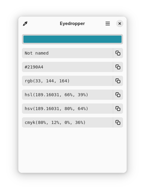 用于拾取和格式化颜色的应用程序。特性: - 拾取颜色 - 以十六进制格式输入颜色 - 解析 RGB/RGBA/ARGB 十六进制颜色 - 以格式查看颜色 - 自定义显示哪些格式以及它们的顺序 - 生成不同色调的调色板