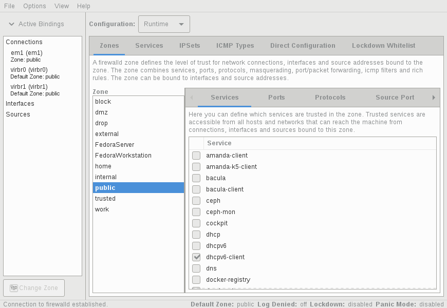 防火墙配置应用程序提供了一个 firewalld 的配置界面。