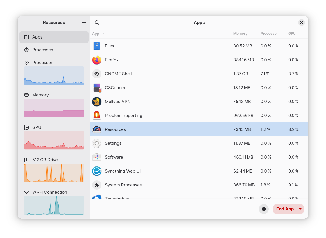 Resources 是一个简单但功能强大的系统资源和进程监视器,使用 Rust 编写,并使用 GTK 4 和 libadwaita 作为其 GUI。